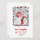 Um modelo moderno e doce de cartão de anúncio de bebê para as festas de fim de ano com tema de folhagem de inverno, apresentando uma moldura botânica caprichosa e desenhada à mão de frutas vermelhas de inverno e corações vermelhos, sobre o modelo de foto na frente e o título "Amor, risos e o primeiro capítulo do bebê".