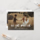Este simples e rústico cartão de anúncio de fuga para casamento apresenta uma foto pessoal do casamento na frente, com as palavras "nos casamos" em uma escrita casual, branca e manuscrita. O verso do cartão tem espaço para outra foto, além de espaço para detalhar os pormenores da fuga ou fornecer detalhes para uma recepção ou celebração após o casamento. Um design caprichoso e elegante que é a maneira perfeita de informar amigos e familiares que você acabou de se casar, especialmente após um micro-casamento ou casamento onde apenas uma pequena quantidade de convidados pôde ser convidada.