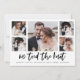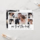 Este simples anúncio de casamento em preto e branco apresenta uma tipografia moderna e casual que diz "nós nos casamos", com uma grade de várias fotos, cinco na frente e mais uma no verso. Uma maneira elegante de informar amigos e familiares sobre sua fuga ou que você está casado.