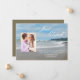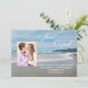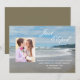 Este anúncio de casamento e fuga é perfeito para qualquer pessoa que tenha fugido para se casar no oceano ou na praia. O design apresenta uma cena de praia com uma foto do casal feliz. As palavras "Fugimos" aparecem no céu e os detalhes da fuga estão escritos na areia. Uma ótima maneira de contar a todos que você fugiu para se casar. Copyright henishouseofpaper