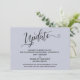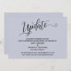 A distinção deste conjunto se deve à fonte de texto elaborada e com curvas usada para as frases de destaque. Caso você precise informar aos seus convidados que o seu casamento foi cancelado, este cartão oferece uma opção elegante. Nesta peça, a fonte caligráfica foi usada para criar um gráfico que representa a palavra "Atualização". Use os campos do modelo para adicionar seus detalhes pessoais e tornar este design único. O fundo pode ser alterado para qualquer cor que você preferir. Por favor, entre em contato para qualquer solicitação especial ou para obter ajuda na personalização. // 98 //