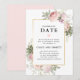 Rosas rosa avermelhado rústicas e flores de hortênsia decoram este modelo de evento adiado. As flores estão aninhadas em flores verdes de sage que decoram uma moldura dourada. A parte posterior do modelo de evento adiado é um rosa suave avermelhado.