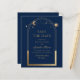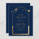 Convite de Aniversário de Quinceanera Azul Celestial apresenta uma moldura de sol, lua e estrelas em dourado em um fundo azul. Dentro está a informação personalizada de save the date da Quinceanera. Personalize editando o texto nas caixas de texto. Criado para você por ©2024 Evco Studio www.zazzle.com/store/evcostudio