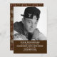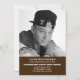 Anúncio de fotos da formatura de adolescente e da casa aberta. Marrom com texto branco e uma grande área de modelo de foto. O nome, a escola e a classe dele são impressos abaixo da foto, juntamente com as informações de celebração. Um padrão de bolas de futebol e baseball cobrir a parte de trás do papel.