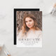 Este anúncio de graduação de fotos apresenta a foto do formando com uma sobreposição de texto preto. A palavra "formando" aparece na tipografia decorativa de contornos. Adicione o nome do formando, a escola e o ano de aula abaixo. A parte de trás apresenta uma elegante crista vintage em torno de um monograma de ouro em fundo preto, junto com espaço para texto destacando as realizações e planos do formando.