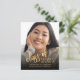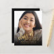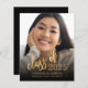 Anúncio de graduação moderno com uma foto vertical personalizada. As palavras "classe de" aparecem em um script de folha falsa em ouro, seguido do ano de classe editável em letra serif aberta e dourada. Adicione o nome do formando e a escola abaixo em fontes brancas sans serif. Substitua facilmente a imagem de amostra pela foto do seu próprio formando. Uma tela de gradiente preto ajuda a garantir que o texto seja pop. O reverso é preto sólido. Ideal para segundo grau ou formandos.