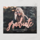 Anúncio de graduação moderno com uma foto horizontal personalizada. A palavra "formando" aparece em um script de folha falsa rosa dourada, com o nome do formando, a escola e o ano de graduação abaixo em letra branca sans serif. Substitua facilmente a imagem de amostra pela foto do seu próprio formando. Uma tela de gradiente preto ajuda a garantir que o texto seja pop. O reverso é preto sólido. Ideal para segundo grau ou formandos.