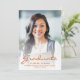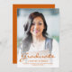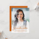 Anúncio de graduação moderno com uma foto vertical personalizada. A palavra "Formando" aparece na escrita laranja queimada, com o nome do formando, a escola e o ano de graduação abaixo na fonte sans serif. Substitua facilmente a imagem de amostra pela foto do seu próprio formando. Uma tela de gradiente branco ajuda a garantir os pop de texto. Adicione detalhes sobre as realizações de seu formando e planos futuros no verso em texto branco sobre um fundo laranja queimado sólido. Ideal para segundo grau ou formandos.