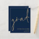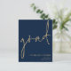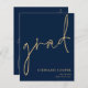 NOTA: há duas opções de papel a escolher para este tamanho (4,5 x 5,6") na faixa de Orçamento. Para este produto, eu recomendaria o semibrilho, que é um estoque de cartão de 110 gsm, semelhante em espessura a um cartão postal. A opção Satin é um papel muito mais fino, 80gsm. O padrão é definido como semirbrilho. POR FAVOR, NOTE que existe UM por folha. Anúncio do Formando Dourado do Marinho de Script de Orçamento Esta simples tipografia dourada no design azul-marinho clássico para anunciar as notícias do seu formando tem um script de escrita manual de conjunto informal para o cabeçalho principal, formando e fácil personalização da tipografia no lado inferior direito com os seus detalhes e também a sua mensagem no verso.