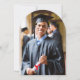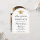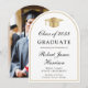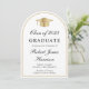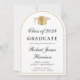 Anúncio formal de formandos branco em forma de arco, com boné de formando de ouro, nome do formando e ano de classe em uma escrita elegante, e sua universidade, major e honra em tipografia serif clássica. A foto deles preenche a parte de trás do cartão.