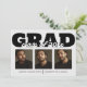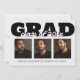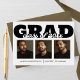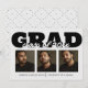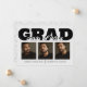 Nosso Bold Grad é um anúncio de formatura perfeito com três fotos do seu graduado orgulhosamente na parte inferior do cartão de anúncio, enquanto uma fonte em negrito escreve Grad. A parte traseira deste anúncio de formatura é um design moderno e trendy de quadrados pretos formando diamantes.