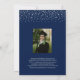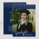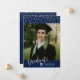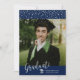 Compartilhe sua celebração especial com sua família e amigos. Este cartão de anúncio de formatura moderno apresenta um elegante "Graduado" em prata e confetes em um fundo azul-naval. Você pode personalizar o texto e as fotos. Suprimentos e presentes para festa correspondentes estão disponíveis na minha loja BaraBomDesign.