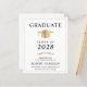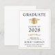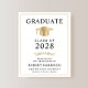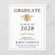 Anúncio de formatura universitária elegante e econômico com um chapéu de graduado dourado e tipografia moderna para o nome do graduado, ano de formatura, universidade ou faculdade, grau e curso ou honrarias.
