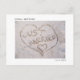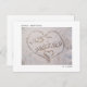 Cartão postal de anúncio de casamento. "Acabamos de Casar" está escrito na areia - ótimo para aqueles que tiveram casamentos de destino, elopamentos, cerimônias de praia ou lua de mel na praia! Adicione sua própria foto de casamento e personalize com os detalhes do seu casamento para um cartão personalizado, fácil de personalizar, para familiares e amigos!