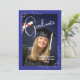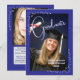Um anúncio personalizável azul e branco para um formando do ensino médio ou faculdade. Há dois espaços para fotos. Personalize com data de formatura, nome da escola, nome do estudante formando e uma nota sobre seus planos após a formatura.