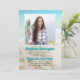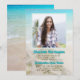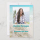 Convite de graduação com tema de praia. Estrela-do-mar e flores brancas, com design de fundo de mar e areia. Adicione a foto dele ou dela para preencher o modelo quadrado. Personalize o texto azul aqua para nome e título da festa (recepção de formatura). O texto marrom impresso é usado para o nome da escola, ano de formatura, curso e todas as informações da festa. Este convite também está disponível como download instantâneo.