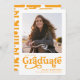 Anúncio de graduação minimalista e simples começa com sua foto. O graduado e o restante do texto são escritos em uma tipografia laranja terracota ousada e atual. Um padrão gráfico ousado dos anos 70 em rosa brilhante, laranja, azul poeirento e verde oliva decora o verso. Este anúncio de graduação fornece a turma de 2023, seu nome e escola.