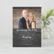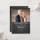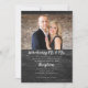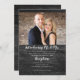 Anúncio de casamento em foto de madeira preta para recém-casados. "Apresentando o Sr. e a Sra." é a primeira linha com um espaço para os detalhes da cerimônia de casamento privada, como local e data. Abaixo disso está o título "Recepção" e informações e RSVP. Adicione uma foto horizontal ao topo sobre um design de textura de madeira.