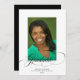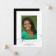 Um anúncio de graduação simples, mas elegante, que inclui uma foto do formando sobreposta com a palavra "formando" em uma escrita cursiva elegante preta, e detalhes de graduação por baixo. O fundo está em branco, e o reverso está em preto.