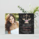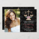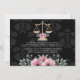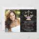 Adicione a sua foto a estes elegantes anúncios de graduação da faculdade de direito, cor-de-rosa, de rosa floral damask, e convites com escalas douradas de design de justiça com flores cor-de-rosa e verde. Personalize-o para dizer o que quiser na parte de trás e na frente dos anúncios e convites de formatura de formando de advogado. Projetado por Chrissy H. Studios, LLC. Todos os direitos reservados.
