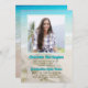 Anúncio de formatura no tema da praia. Starfish e flores brancas, com design de fundo de mar e areia. Adicione sua foto para preencher a modelo quadrada. Personalize o texto azul aqua para o nome e o título da festa (casa de graduação aberta). O texto em castanho impresso é usado para nome da escola, ano de aula, principal e todas as informações da festa. Este convite também vem como um download instantâneo.