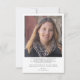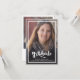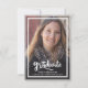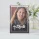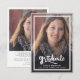 Um anúncio de formatura moderno e elegante com duas fotos. Apresentando uma foto em tamanho real na frente com texto branco sobreposto e uma foto no verso com detalhes opcionais.