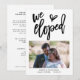 Uma maneira elegante de informar seus amigos sobre sua fuga para casar e convidá-los a se juntarem a você para uma celebração pós-casamento também! Conjunto elegante com a inscrição 'Nós Fugimos para Casar' na frente em preto, abaixo da qual você pode adicionar sua foto favorita do casamento, e personalizar seus nomes, data e local da cerimônia. No verso, personalize facilmente com os detalhes do seu anúncio e convite.