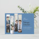 Estes modernos anúncios de graduação de 7 x 5" contêm espaços reservados para quatro fotos recortadas exclusivamente para mostrar sutilmente suas fotos favoritas em um fundo azul cobalto com marfim e letras pretas. A parte traseira da carta é preta com design de marfim.