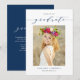 Anuncie sua formatura para familiares e amigos com este cartão de graduação personalizável. Ele apresenta caligrafia caprichosa azul marinho e tipografia clássica. Personalize este simples cartão de anúncio de graduação adicionando sua foto, nome e nome da escola. Este cartão de anúncio de graduação com foto em estilo script é perfeito para formaturas do ensino médio ou faculdade.