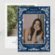 Mostre seu graduado em um divertido anúncio de foto estilo festa, apresentando tons azuis ousados e detalhes vibrantes. Personalize facilmente com a foto do seu graduado e informações da festa para criar algo pessoal e atraente.