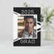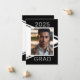 Crie os modernos cartões de anúncio da graduação em preto e branco para enviar para a família, amigos e colaboradores. Um lado exibe sua foto do formando, assim como o ano de aula. O outro lado apresenta os detalhes da formatura junto com informações para a festa de comemoração. Use a modelo para personalizar.