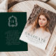 Este anúncio de graduação de fotos apresenta a foto do formando com uma cobertura de texto verde-escuro. A palavra "formando" aparece na tipografia decorativa de contornos. Adicione o nome do formando, a escola e o ano de aula abaixo. A parte de trás apresenta uma elegante crista vintage em torno de um monograma branco inicial sobre fundo verde escuro, junto com espaço para texto destacando as realizações e planos do formando.