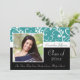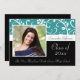 Convites à graduação com palha aqua azul-esverdeada, Design preto-e-branco, com flores e vinhas sujas e correntes. Estilo bonito, chico, delicado e feminino para qualquer garota ou formando feminino. Mostre seu estilo pessoal com este belo convite para formando fotográfico. Excelente como anúncio de graduação ou convite para festa de formatura.