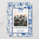 Anúncio de Graduação de Foto do Arco Azul Coquette com um padrão azul clássico de toile de juoy no verso.