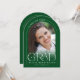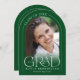 Este anúncio de graduação em arco simples e verde apresenta um delicado quadro de arco, 2 modelos de fotos e elegante tipografia moderna.