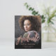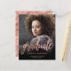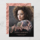 Anúncio de graduação moderno com uma foto vertical personalizada. A palavra "formando" aparece em um script de folha falsa rosa dourada, com o nome do formando, a escola e o ano de graduação abaixo na letra rosa cor-de-rosa sans serif. Substitua facilmente a imagem de amostra pela foto do seu próprio formando. Uma tela de gradiente preto ajuda a garantir que o texto seja pop. O reverso apresenta um padrão glamouroso de rosa dourado de folha de bolinhas. Ideal para segundo grau ou formandos.