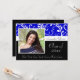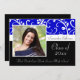 Convites à graduação com Design azul-clássico, preto-e-branco com flores e vinhas sujas fluídas. Estilo bonito, chico, delicado e feminino para qualquer garota ou formando feminino. Mostre seu estilo pessoal com este belo convite para formando fotográfico. Excelente como anúncio de graduação ou convite para festa de formatura.
