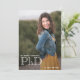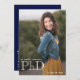 Um anúncio de graduação de PhD de foto que inclui seu nome, ano de aula, uma mensagem personalizável e muito mais. A frente do anúncio mostra uma foto vertical. O outro lado tem um fundo azul com texto branco. Simplesmente troque a foto, personalize as palavras, adicione o anúncio ao seu carrinho, e deixe que todos saibam que você fez algo grande. Licenciatura em Foto Minimalista Classe de Anúncio de PhD de Feriado de 2023 Design | ©Melissa Patton - Designer<i>Fotografia © Storytree Studios, Stanford, CA</i>