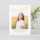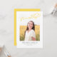 Este moderno anúncio de graduação mostra a palavra finalmente escrita em amarelo ensolarado sobre uma foto de solteiro. A parte traseira do cartão pode ser usada como texto adicional ou como convite.