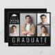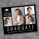 Anúncio de graduação em preto moderno e amigável do ponto de vista orçamental, com uma colagem de 4 fotos, "Formando" escrito em letras brancas grandes e o seu ano de aula, nome e escola ou universidade em tipografia branca simples.