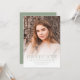 Este anúncio de graduação de fotos apresenta a foto do formando com uma camada de texto verde sábio. A palavra "formando" aparece na tipografia decorativa de contornos. Adicione o nome do formando, a escola e o ano de aula abaixo. A parte de trás apresenta uma elegante crista vintage em torno de um monograma branco inicial em um fundo verde sage, junto com espaço para texto destacando as realizações e planos do formando.