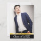 Comemore seu formando com este anúncio clássico e simples de graduação de três fotos. A imagem vertical com simples tipografia é perfeita para mostrar fotos de mais velho. O tipo inclui muito espaço para nome, escola e ano de "classe de", que corresponde ao verso do cartão. A cor preta pode ser ajustada a qualquer cor escolar clicando em "Personalizar mais".