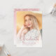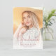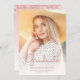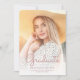 Anúncio de graduação moderna da Tendy com uma foto vertical personalizada. A palavra "Formando" aparece em um guião de manuscrito em rosa, com o nome do formando, a escola e o ano de graduação abaixo em sans serif. Substitua facilmente a imagem de amostra pela foto do seu próprio formando. Uma tela de gradiente branco ajuda a garantir os pop de texto. O reverso apresenta uma borda brilhante de pingar cintilação rosada e girada em um fundo cor-de-rosa.