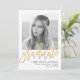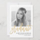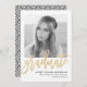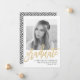 Anuncie sua formatura com um anúncio de formatura moderno e chique. O design apresenta uma fonte de script de tendência em um estilo de folha de ouro falso, espaços reservados para uma imagem e texto personalizado e um padrão de deco de arte preto e branco no verso.