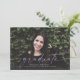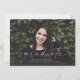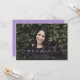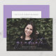 Este anúncio de graduação de fotos sangradas do cheio apresenta a palavra "formando" escrita em roxo na frente. Tem espaço para o nome do formando, ano de aula e escola. A parte traseira do cartão pode ser usada para uma mensagem pessoal ou para os detalhes do convite de festa de formatura.