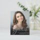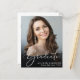 Uma opção favorável ao orçamento para anunciar as conquistas do seu formando. Este anúncio de graduação em na moda apresenta sua foto favorita com "Formando" escrito em cima em um roteiro elegante e branco. Por baixo, você pode adicionar o nome dela, ano escolar e de aula. No verso, adicione uma fotografia adicional e uma mensagem personalizada.