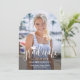 Compartilhe a alegria de um segundo grau ou formandos com anúncios de fotos descarregáveis com na moda. As fotos e o texto deste modelo são simples de personalizar e as cores são fáceis de mudar usando a ferramenta Zazzle design. Inclua todos os detalhes de sua escolha, como informações sobre o convite de festas, nomes de pais, honras especiais, título de grau, citação de inspiração favorita, informações de contato do formando ou planos para o futuro. O design moderno preto e branco apresenta um boné de conselho de argamassa, caligrafia de script de tendências, tipografia clássica elegante e duas fotos de sua escolha, como fotos de mais velho ou imagens da cerimônia de início. Este chic downloadable graduation card é uma na moda para anunciar uma celebração especial de dia. Parabéns ao formando!