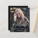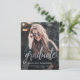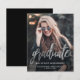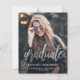 Anúncio de graduação moderno com uma foto vertical personalizada. A palavra "formando" aparece em um roteiro falso prateado, com o nome do formando, a escola e o ano de graduação abaixo em letra branca sans serif. Substitua facilmente a imagem de amostra pela foto do seu próprio formando. Uma tela de gradiente preto ajuda a garantir que o texto seja pop. O reverso é preto sólido. Ideal para segundo grau ou formandos.