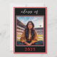 Moderno e chic, este anúncio de graduação combina preto clássico e branco com acentos de vermelho vivo. É design mínimo é um design simples e divertido para celebrar o grande dia do formando. O verso exibe a foto favorita do seu formando. Criado pela imprensa simplesmente de farmácia.