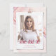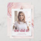 Ela Fez! Chic | Anúncio de graduação em tipografia moderna. Este anúncio de graduação em na moda apresenta um belo fundo de abstrato de aquarela rosa em uma foto que é projetada para se parecer com um instantâneo vintage enquanto ainda é na moda para o formando de hoje.